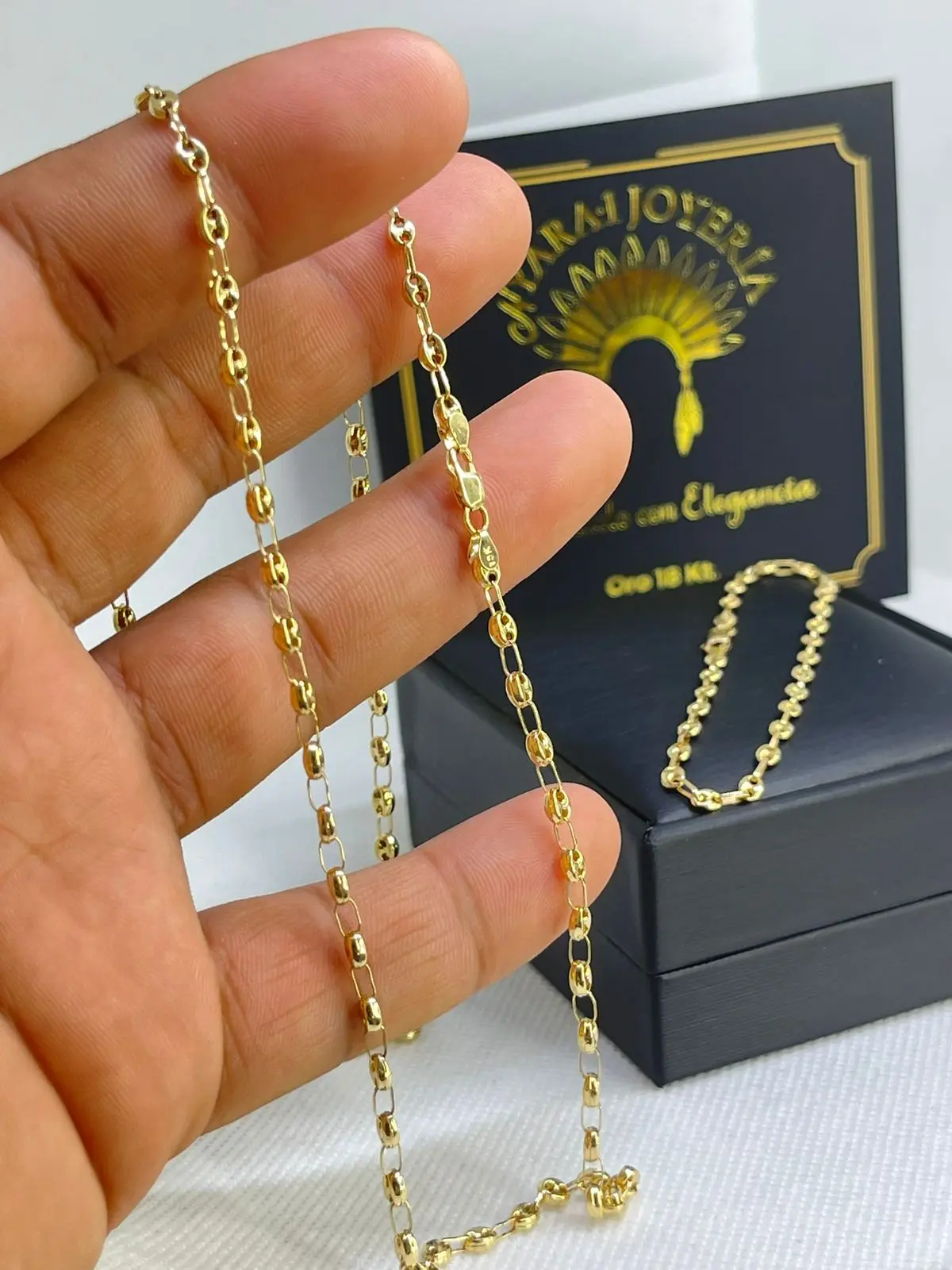 Todas nuestras joyas están elaboradas en oro de 18 Kilates. Nuestras prendas se entregan con su factura de compra y certificado de autenticidad.
